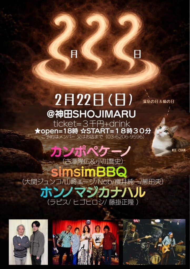 2026年1月29日 / 最終更新日 : 2026年1月29日 simsimBBQ Live Schedule 2026年2月22日(日) 神田 THE SHOJIMARU 日付 2026年2月22日(日) 会場 THE SHOJIMARU (東京都千代田区神田須田町1-4-6 吉川ビルB1) 出演 カンポペケーノ / simsimBBQ / ホンノマジカナハル 開場/開演 18:00/18:30 料金 ¥3,000+1D